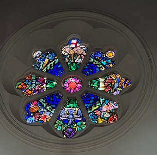 Another glass window is a beautiful depiction of God’s creation, filled with vibrant images of planets, fish, birds, animals, and underwater creatures. These images reflect the wonder of God's handiwork in the natural world. The colorful design invites the viewer to reflect on the beauty and diversity of creation, serving as a reminder of God's power and creativity.