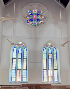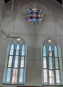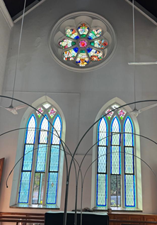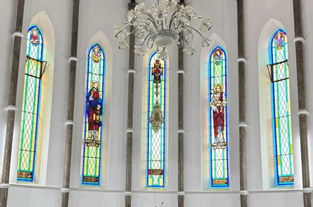 Above and around the altar, the five windows bring an ethereal quality to the space. The windows feature biblical scenes, casting vibrant hues of blue, red, gold, and green on to the altar and the surrounding area. The light through these windows changes throughout the day, creating a living artwork of shadows and colors that deepen the spiritual experience of all who enter.